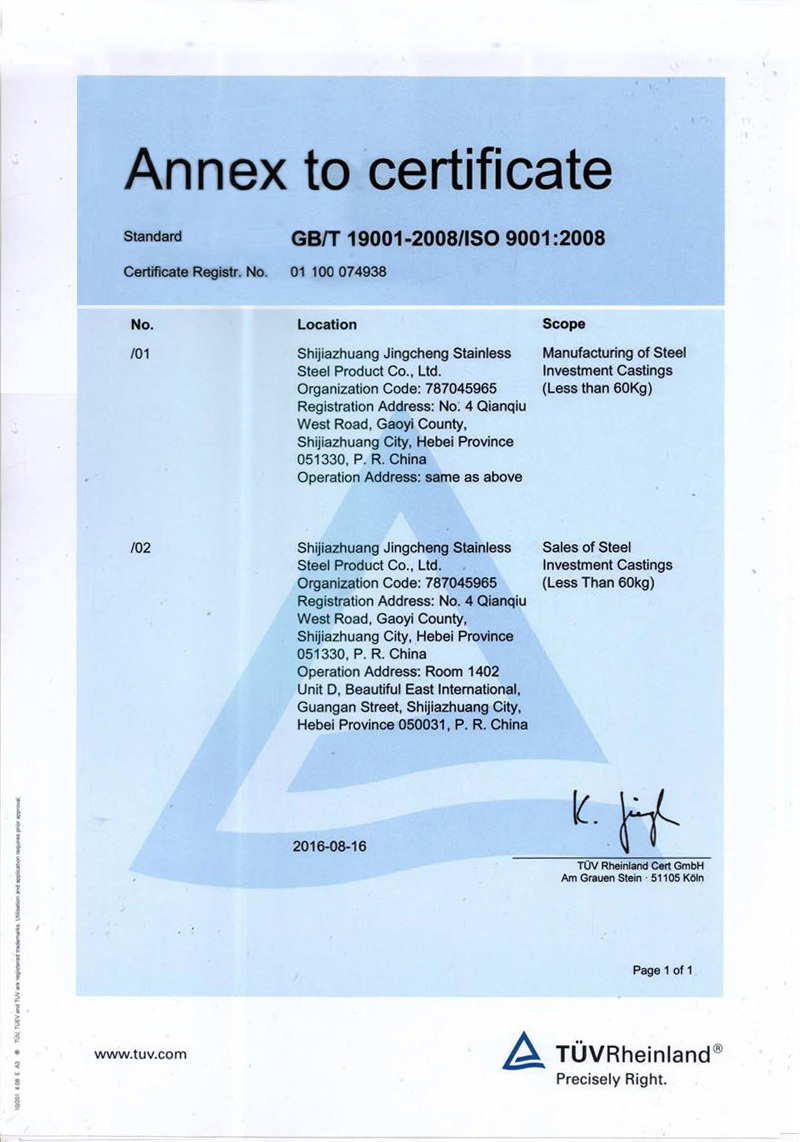 石家莊市精誠(chéng)不銹鋼制品有限公司,是一家從事專業(yè)精密鑄造的企業(yè)。主要生產(chǎn)不銹鋼、合金鋼、低碳鋼及各種特種合金材質(zhì)的精密鑄件及加工產(chǎn)品。